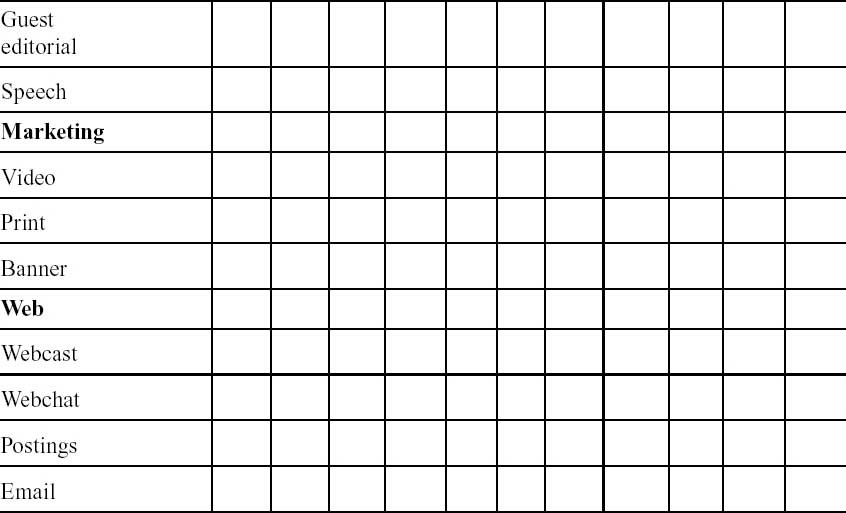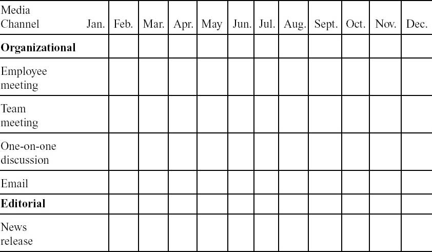 Use the following table as a monthly media planner to develop your next leadership communications initiative.