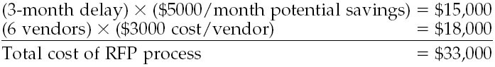 As an aside, many organizations talk long and loud about their cost of sales. Amazingly, though, few calculate what it actually costs to generate and monitor RFPs with multiple vendors. Consider an organization that issues an RFP to six vendors, with the intent of stirring up a price war, for a $75,000 transaction that has the potential to allow them to save $5000 per month. Conservatively speaking, the time to generate, publish, distribute, and provide adequate time for vendors to respond to the RFP will add 90 days to the process. Let's also assume a cost in labor-hours of $3000 for the resources required to interact with six vendors (again, that's conservative). Without regard for the time and effort needed to actually write the RFP, which may involve expensive talent, here is an estimate of the imbedded costs: