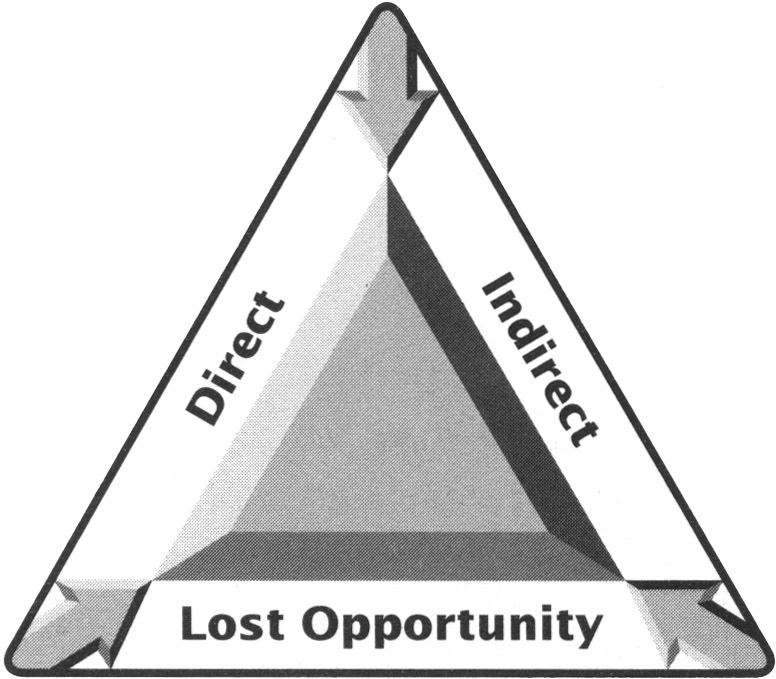 When we talk about the total cost of the problem, we are not saying that you must establish a precise figure. Rather, the cost must be generally accurate. Calculating costs is a process similar to the navigational method known as triangulation. By sighting off of three points - the direct numbers, indirect numbers, and lost opportunities - we can arrive at a cost that is accurate and, most importantly, believed by the customer (see Figure 5.2).