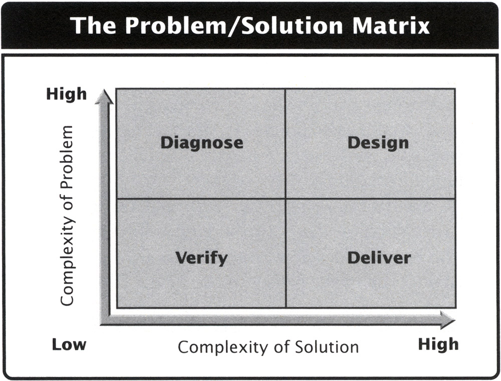 In the upper right-hand quadrant of the matrix, both problems and solutions are complex, and we would place special emphasis on the Design phase of the process. When problems and solutions are complex, customers find it difficult to connect the two. Thus, the solution designer's ability to align the problem to the best solution becomes a paramount concern.