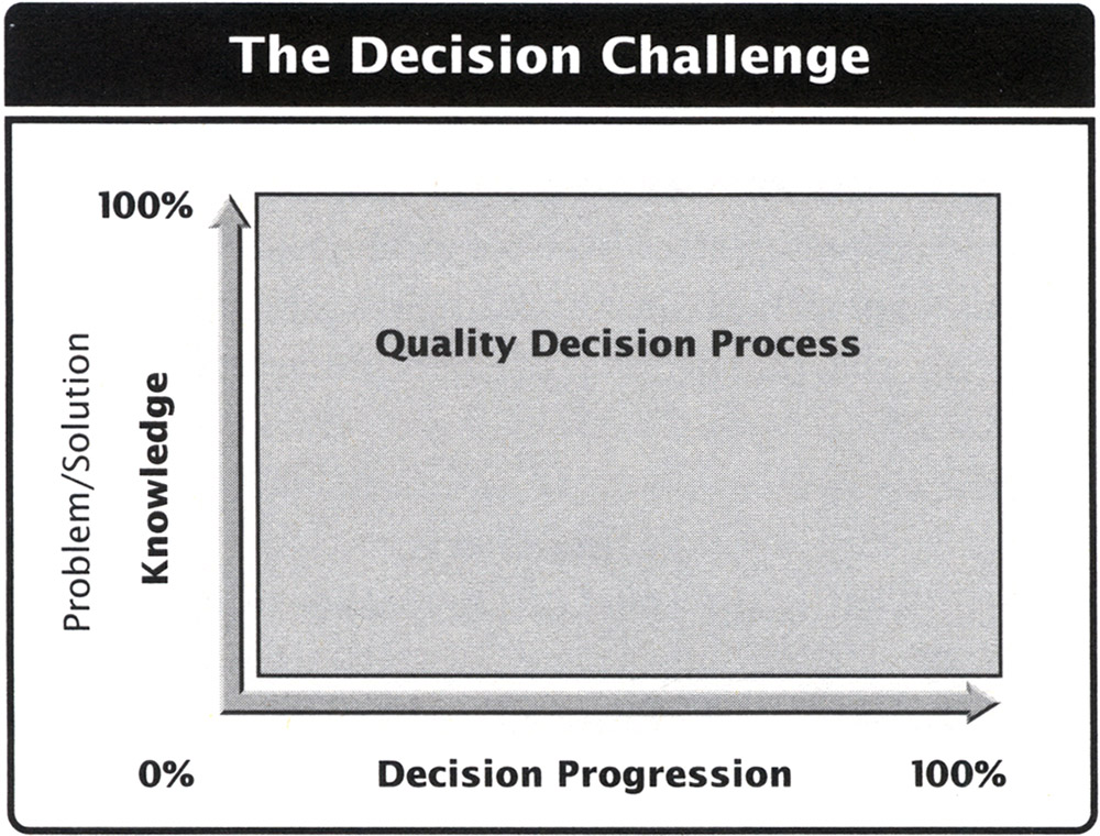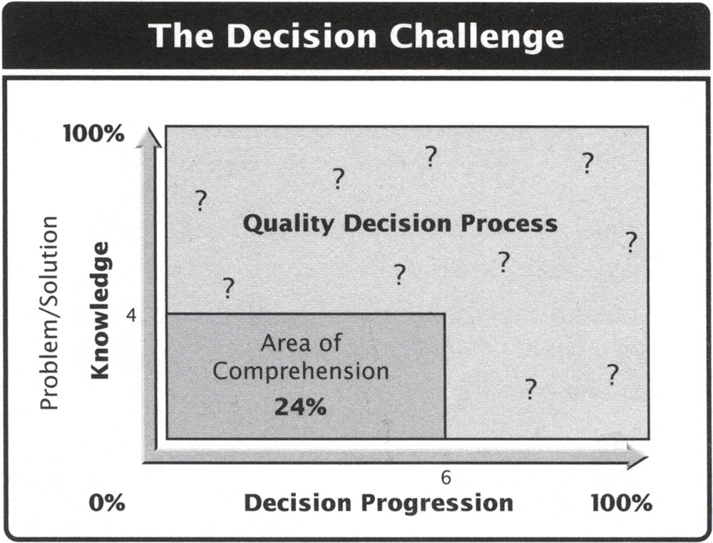 We use the Decision Challenge graph to illustrate this basic and often overlooked reality (see Figure 2.1). The graph's horizontal axis represents the customer's position in their decision process. The progression ranges from 0 percent, at which point customers have no idea there is a problem, to midpoint, where they recognize a problem and are actively investigating solutions, to 100 percent, at which point the customer has made the purchase. The graph's vertical axis represents the customer's level of knowledge about the problem and knowledge of possible solutions. At zero, customers have no knowledge of the types of problems they may have or the problems you solve; at the top of the scale, they have complete, or perfect, knowledge of their problems and the solutions required to solve them. They know everything needed to make a well-informed, high-quality decision - what to look at and for, what to measure, what to compare, what to test, and so on. Finally, the field of the graph formed by these two axes represents the customer's overall comprehension.
