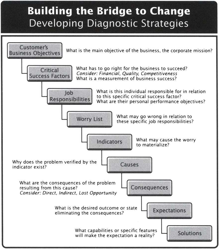 This sequence is called the bridge to change and is patterned after the methods physicians are taught to diagnose complicated medical conditions and prescribe appropriate solutions (see Figure 3.2). It guides salespeople by establishing a questioning flow capable of leading their customers through enterprise decisions. More importantly, it allows salespeople to pinpoint the areas in which they can construct value connections that will benefit their customers.